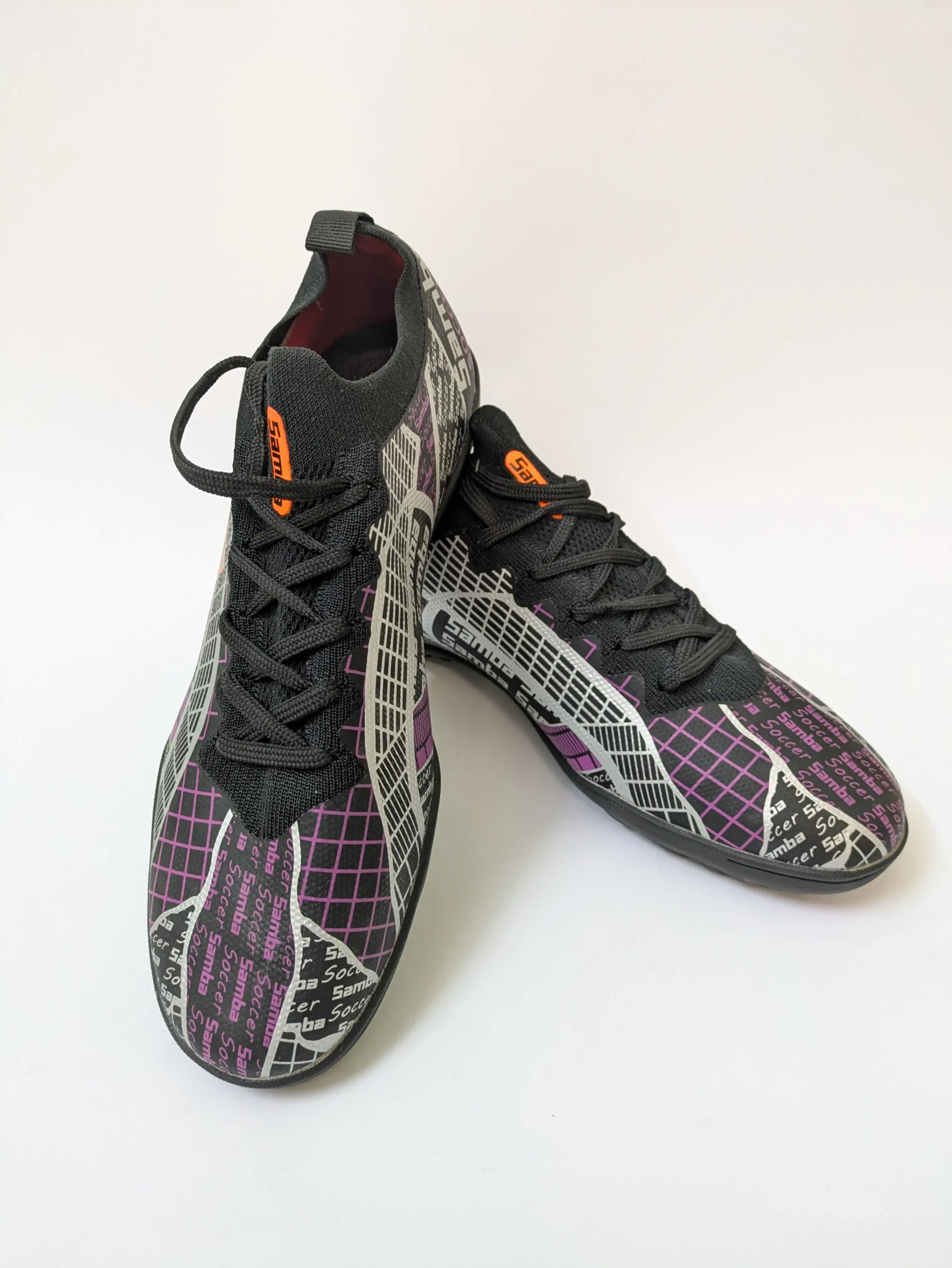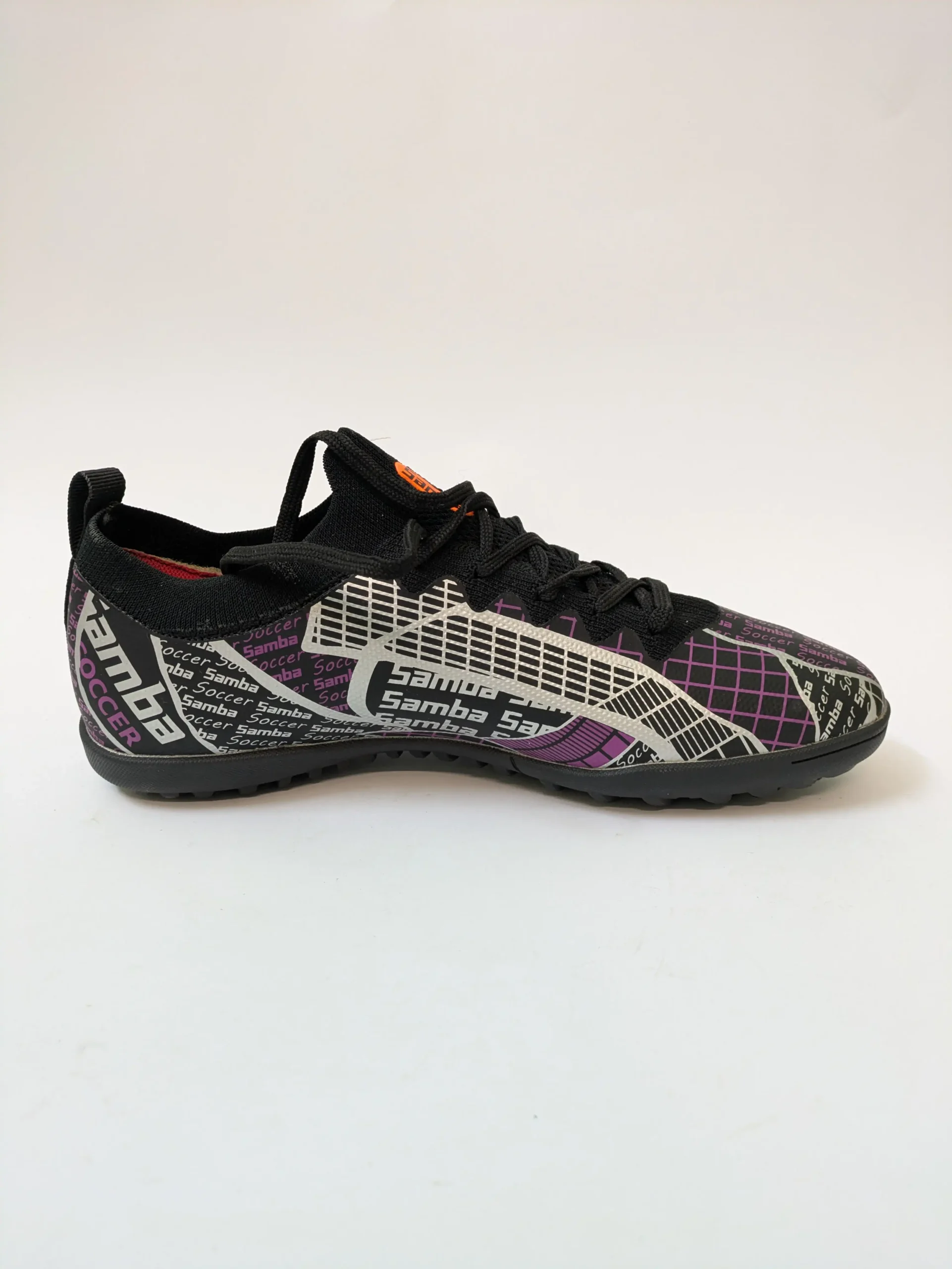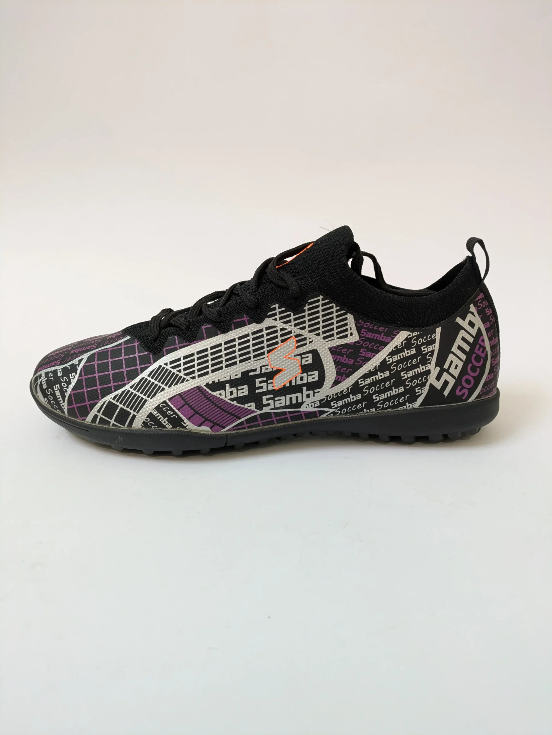 These are Samba Soccer Turf Shoes in black and purple, designed for players who want control, comfort, and traction on artificial turf or indoor surfaces.