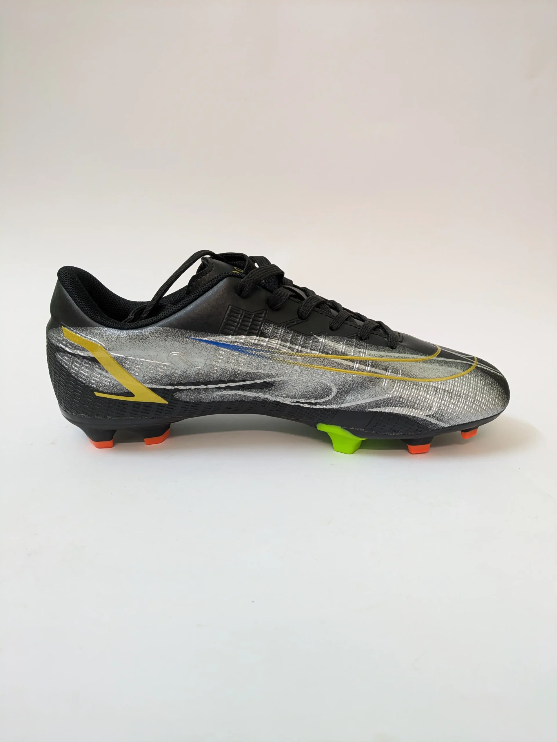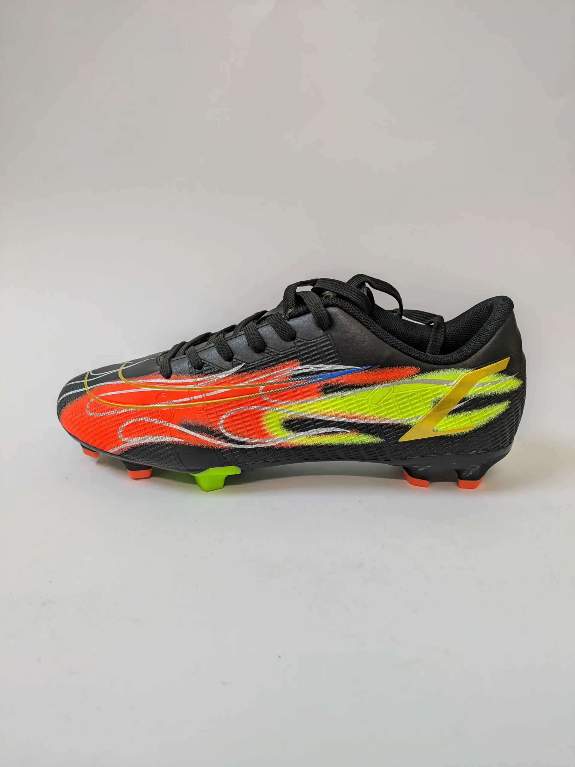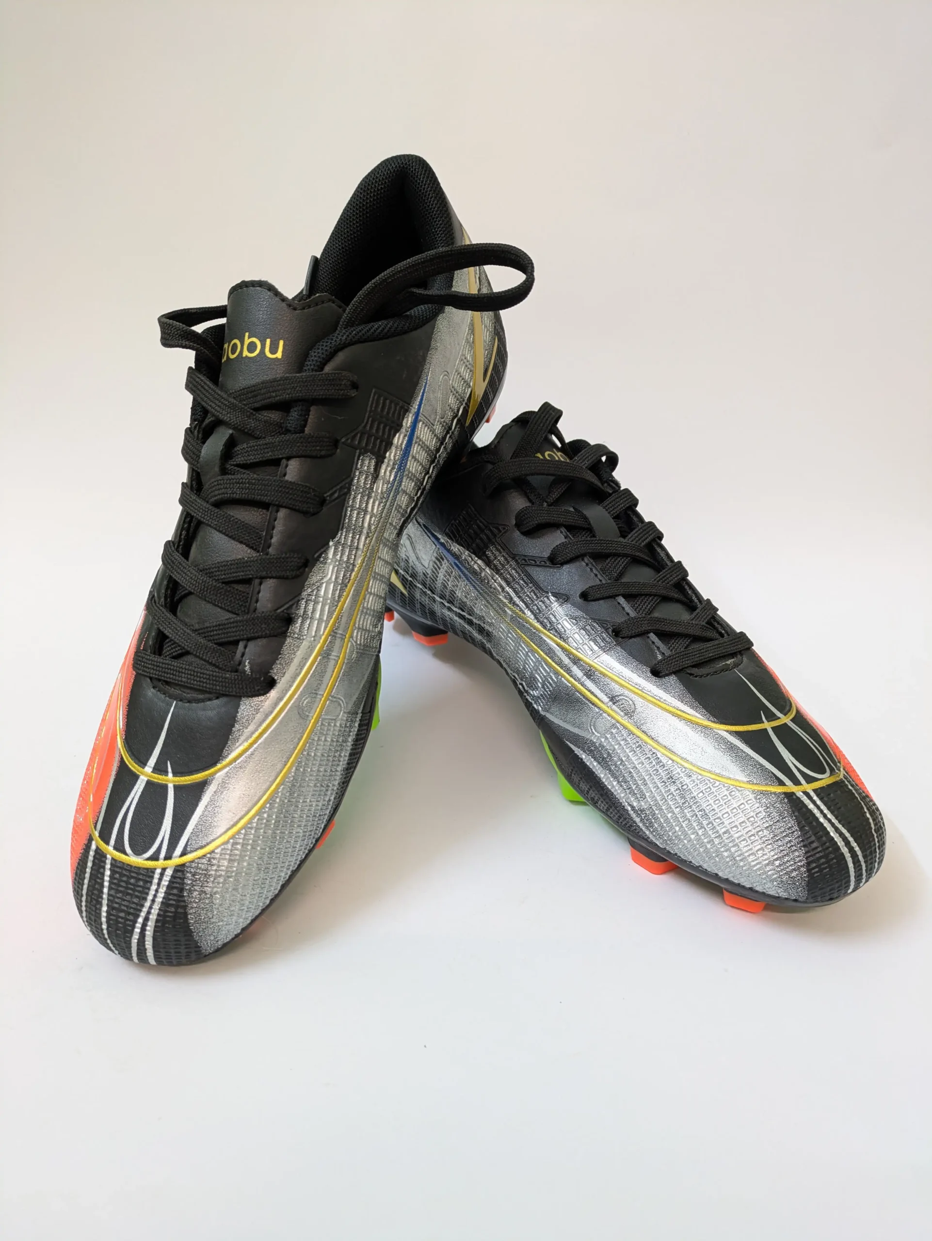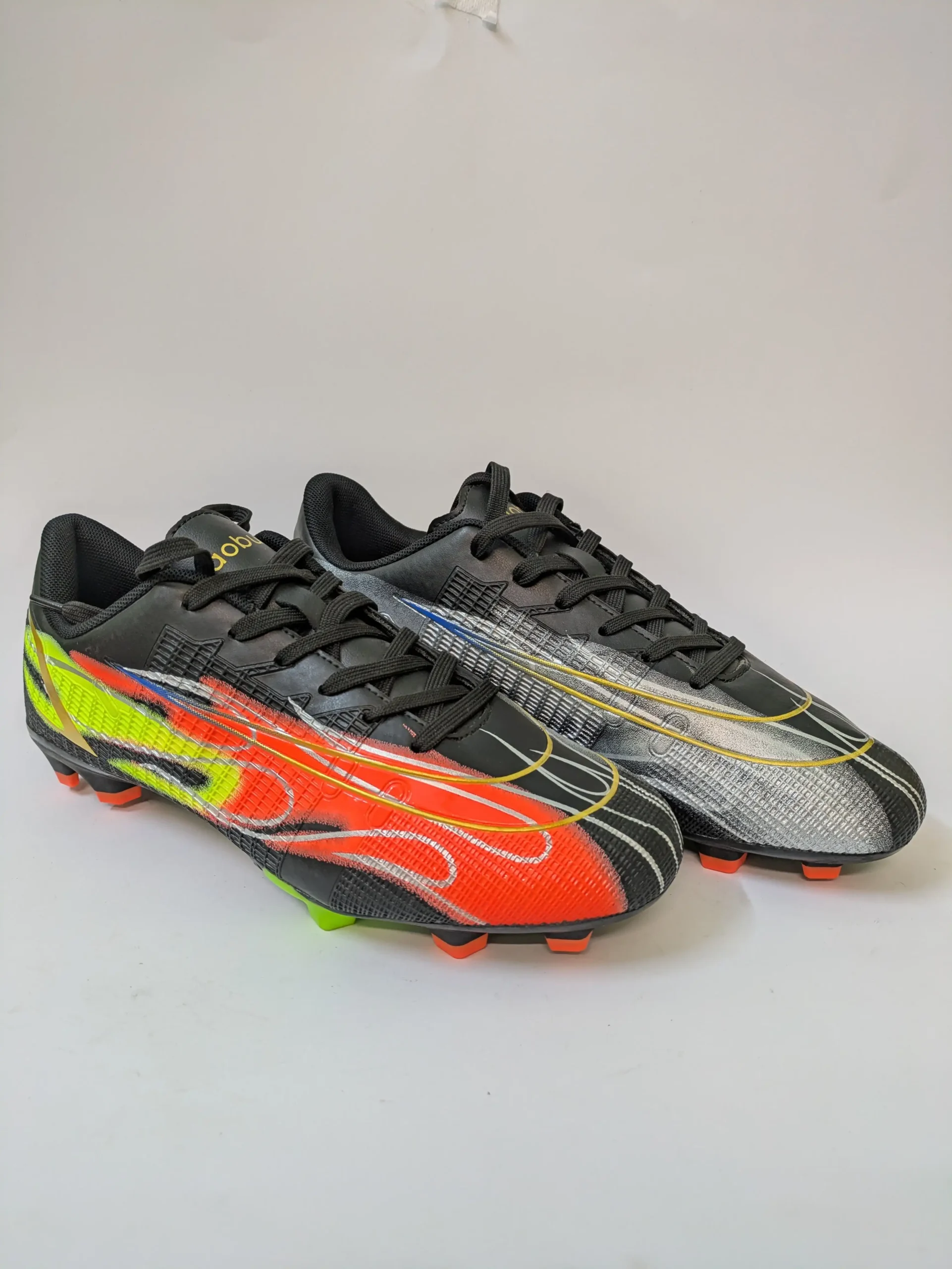 This is a pair of black, orange, and yellow R.xjian soccer shoes designed for comfort, durability, and performance on the field. Featuring a microfiber upper and a rubber sole, these shoes provide excellent grip, flexibility, and stability during training sessions and matches.